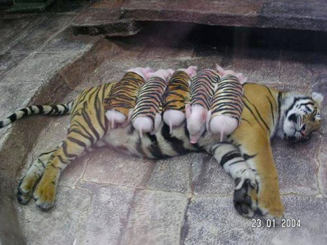 After checking with many other zoos across the country, the depressing news was that there were no tiger cubs of the right age to introduce to the mourning mother. The veterinarians decided to try something that had never been tried in a zoo environment. Sometimes a mother of one species will take on the care of a different species. The only orphans that could be found quickly, were a litter of weanling pigs. The zoo keepers and vets wrapped the piglets in tiger skin and placed the babies around the mother tiger. Would they become cubs or pork chops?