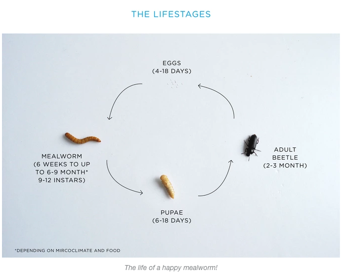 The mealworm is the larva stadium of the meal beetle (Tenebrio molitor). The adult beetles mate and lay eggs of which little mealworm babies hatch. These grow into a mealworm of the size you like to eat (ca. 3cm long). Some of them will transform into pupae and be separated once you activate the harvest process. The pupae will become beetles again. That´s why you put them into the pupation chamber again to restart your lifecycle.