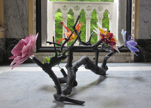 Lucy + Jorge Orta’s Amazonia Tree of Life, commissioned for the Venice venue of this traveling exhibition, are blossoms of handcrafted glass flowers, grafted onto branches from a Mediterranean olive tree, extending outward from the trunk. Amazonia Tree of Life follows the trajectory of Lucy + Jorge Orta’s ongoing Perpetual Amazonia project. During their 2009 expedition to the Peruvian Amazon the artists photographed hundreds of rainforest plant species, creating a personalized collection of florilegium they continue to add to during their travels across the world. These florae have since been transformed into large format photographs, drawings, handcrafted couture works, and porcelain objects. The latest interpretations in glass have been blown by the master craftsman Danilo Zanella at Berengo Studio.