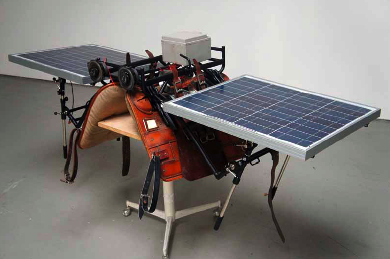 Harnaché, l’âne est équipé d’un dispositif qui converti l’énergie solaire en électricité. Il broute, voyage de site en site, se charge en électricité. Une fois les batteries pleines, l’animal avec son kit et sa prise femelle, peut servir quiconque : recharger un téléphone portable, une batterie de voiture, alimenter une radio, une lampe, un sèche-cheveux. Reprenant la symbolique du porteur d’eau, ce Pégase est un animal de service. Ambigu, incongru, écologique et qui sait, visionnaire, il oscille entre progrès et décadence. Non sans humour, Pégase pèse sur le mythe solaire avec sa parure profane. Ce Pégase – assurément insolite – poserait-il la question de l’hyper modernité, de la fin des énergies fossiles, de la locomotion lente ? En cette période de crise et de croissance molle, Pégase porte ses ailes, aujourd’hui il livre du courant.