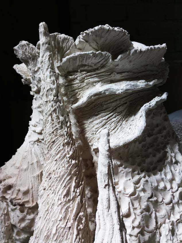 « Le discours de l’échafaud est une pièce qui propose le dialogue entre deux fondamentaux artistiques classiques : nature et culture. Sans dissocier ou opposer l’un au profit de l’autre, l’oeuvre se constitue avec l’un et l’autre. Du tronc de l’arbre à la colonne de pierre, le passage est ténu. Ces colonnes, fascinantes et inquiétantes, soulèvent des questionnements actuels comme les peurs d’un avenir apocalyptique, la désillusion du progrès ou encore la suprématie de l’homme sur la nature… Semblables à de grandes stalagmites ou à des monts hydrothermaux, elles laisseraient également apparaître des formes symboliques de l’antiquité comme des volutes, des feuilles d’acanthe, des cannelures… Ce projet céramique est un récit qui pourrait s’apparenter à un mythe fondateur. Soulevant la question de la ruine en même temps que celle de la genèse, ce projet interroge la condamnation potentielle de la société humaine, soumise à présent à l’impératif consumériste. »