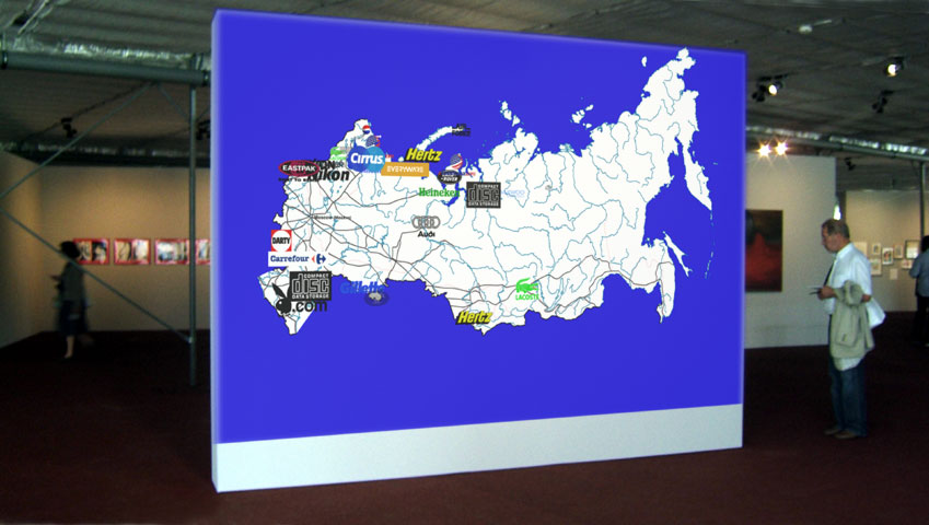 Sur l’écran, une carte de l’Arctique. Des logos de groupes majoritairement pétroliers comme Shell, Esso, Total, Tschudi, y apparaissent au fur et à mesure. Le rythme s’accélère, les logos se superposent de plus en plus vite, s’empilent, s’amassent jusqu’à déborder de l’écran : le programme se met à délirer tout seul. A la fin, ça explose, ça ne devient plus supportable. Cette oeuvre est une mise en garde contre les risques qui guettent cette région riche en réserves de pétrole et encore peu exploitée. Aprés les guerres de religion, les guerres d’empires, les guerres politiques, on assiste aujourd’hui à la guerre des marchés entre multinationales. La plupart des problèmes politiques découlent de ce nouveau partage du monde.